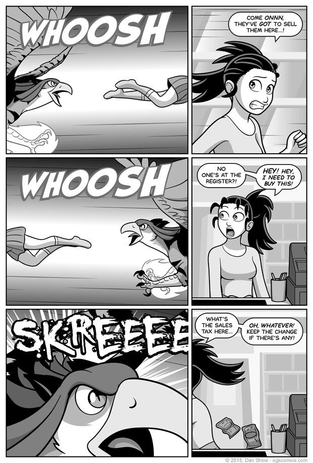By the way, random missing clerk? I know there's a griffin flying around after a super hero outside, but you took an OATH, darn it. At least, I assume you did. I've never worked in a mall, but I'm pretty sure that's part of the deal.