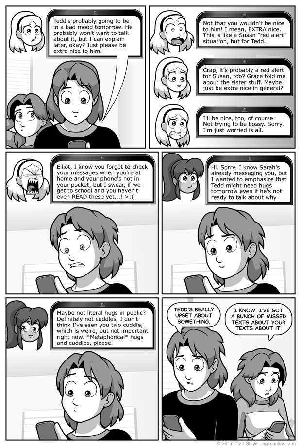 Speaking of panel three, I like how Elliot's face and hair turned out in it. Elliot is actually one of the more difficult characters for me to draw, and part of that is because one wrong subtle move with his jawline or hair can spell disaster. Panel three in particular is a good example of what I'm at least trying to go for with Elliot's head and hair.