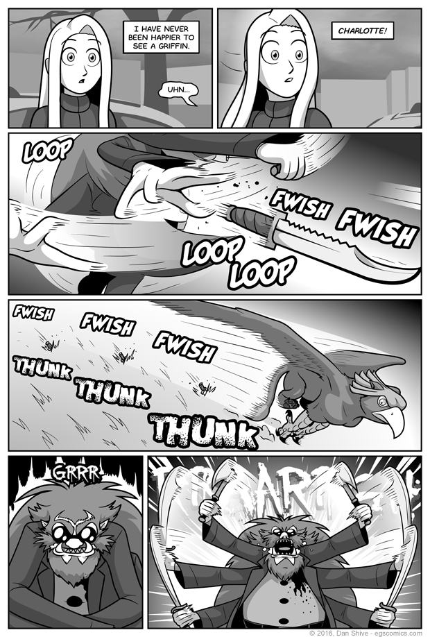 Seriously, I have little experience with elaborate fight scenes, and at some point I said to myself "self, you're going to draw an elaborate fight scene between a six armed spider vampire and a magical griffin."