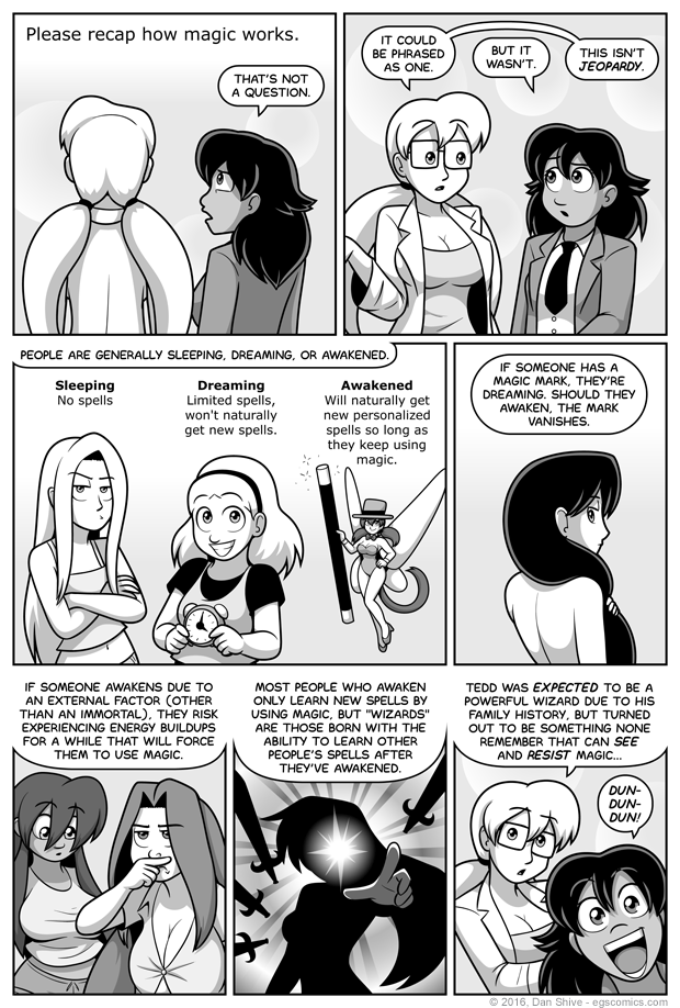 As for what the heck Tedd's magic nature is all about, there is an explanation, and it will be possible to guess what it is before the inevitable reveal about it. Probably not enough to go on yet, but hey, speculators have surprised me before.