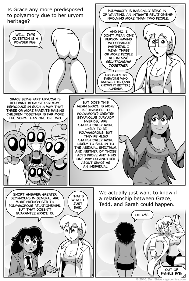 I felt as though this question put me in something of an awkward position, as I did want to address the things talked about in the comic, but I didn't want to give the impression that Grace is polyamorous by default just by virtue of being part uryuom, or that her being part uryuom would have to be the reason for it if she was. There are plenty of people who are polyamorous who are, I assume, NOT part uryuom, and that doesn't need to be the explanation for Grace if she is.