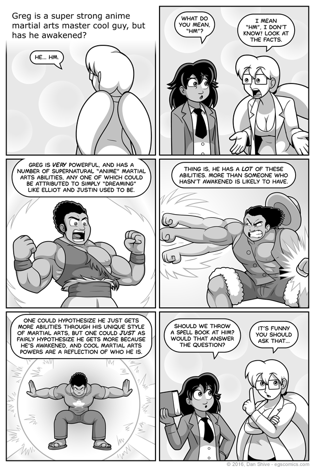 I did something a bit experimental for this comic in which I drew the comic first as a super small thumbnail, resized it, slapped it on a layer, and sketched the larger sketches over that. It made drawing this comic much more easy than usual, and that's even with Greg being a cool martial arts guy.