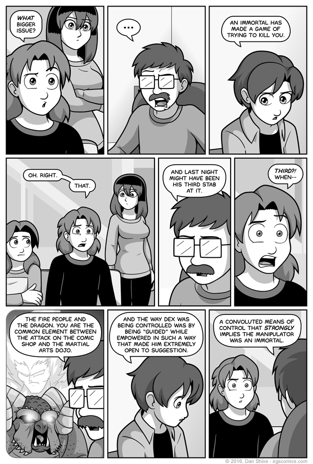 El Goonish Shive Introductions The Goo Shade, Part 1 Q&A #1 Shade, Part 2 Relations, Part 1 April Fools Week Relations, Part 2 Catnip Sister Part 1 - Open The Box Part 2 - Read The Rules Part 3 - Set Up The Pieces Part 4 - Play The Game Part 5 - Knock The Board Over Part 6 - Scattered Pieces Part 7 - Fist Fight Part 8 - Clean Up New And Old Friends Flipping Cardboard Lady Mysterious II slooF lirpA Squirrel Diplomacy Lunchtable Revelations Night Out Part 1 - Martial Arts Crew Part 2 - Elliot's Crew Part 3 - Ellen's Crew The Morning After Q&A #2 Tam Eh Tedd Painted Black Part 1 - Walk In The Park Part 2 - Missing Persons Part 3 - Interviewed By The Devil Part 4 - Into The Dungeon Part 5 - The Truth About Grace Part 6 - The Brewing Storm Part 7 - Fallen From Grace Part 8 - Humanity PB Special Features Shadows After Dark Sleepy Time Second Life The Child Left Behind Red Alert Before The Party Moping Squirrel Intro to South Party Recruiting Even More Recruiting Party Fashion Family Reuinion Grace's Birthday Party Part 1 - Arrivals And Presents Part 2 - Bending Genders Part 3 - Festivities Part 4 - Hold On Hope The After Party Q&A #3 Hidden Genesis Hidden Genesis In The Shadows The New Students Susan Draws The Line Squirrel In The Classroom Sister 2 Part 1 - The Trials Of Susan Part 2 - The Statue Part 3 - Pent-Up Magic Part 4 - Evil Monkey Part 5 - Moperville News Part 6 - Weregirl Part 7 - The Dark Clouds Gather Part 8 - Talon vs. Scythe Part 9 - Wrath of God Part 10 - Pandoras Box Q&A #4 Q&A #4 Bringing Silly Back Indiana Elliot And The TOSF T-Minus The Demon Ally Hammerchlorians - 1 Hammerchlorians - 2 Hammerchlorians - 3 T-Minus Dark Allegiance New And Old Flames - 1 New And Old Flames - 2 New And Old Flames - 3 New And Old Flames - 4 New And Old Flames - 5 New And Old Flames - 6 Q&A #5 Q&A #5 9001% Serious One Way Road Legends of Celida Death Sentence - 1 Death Sentence - 2 Death Sentence - 3 Death Sentence - 4 Death Sentence - 5 What Is Love Summer The End Of Spring Power Fantasy Rocks Fall Nobody Is Hired Nepotism Hair By The Numbers Duel Of The Discs There Be Whales Here There Be Whales Here Pt 2 There Be Whales Here Pt 3 The Dawn End Of An Era End Of An Era pt 2 Family Tree Family Tree Part 2 - Arrival Family Tree Part 3 - Par-TAY Family Tree Part 4 - Weirdness Family Tree Part 5 - A Troll Family Tree Part 6 - Banhammered Family Tree Part 7 - Hangover Q&A #6 Identity Identity Part 2 - Reactions Identity Part 3 - Cat Attack Identity Part 4 - Detective Sarah Identity Part 5 - Basement Chat Identity Part 6 - ILLOGICAL! Identity Part 7 - Dreams identity Part 8 - Ashley Identity Part 9 - Detective Susan Identity Part 10 - Ashley and Elliot Identity Part 11 - Epilogue Summer Moments Guest Comics Guest Comics #1 Guest Comics #2 Pandoras Box Squirrel Prophet SP - Part 2 SP - Final Battle So A Date At The Mall So A Date - Part 2 So A Date - Part 3 So A Date - Part 4 So A Date - Part 5 EGSNP - Question Mark Q&A 7 - The Requestioning Sister 3 - Catspaws Part 1 - Legacy Part 2 - The Will of Magic Part 3 - Reply Hazy Part 4 - Everyone Needs To Talk Part 5 - The Reservoir Part 6 - Maybe Sisters Part 7 - An Unkindness Part 8 - Awkwardness Ahead Part 9 - Traffic Freeze Part 10 - Fluidity Part 11 - All Of The Curse Words Part 12 - Misanthropy Part 13 - In Search Of Wisdom Part 14 - Sister Anxiety Part 15 - Elliot and Ellen Part 16 - BFFs Part 17 - Great Fairy Godmother Part 18 - Gathering Monsters Part 19 - Family Meetings Part 20 - Geminis Part 21 - The Other Dunkel Part 22 - Apocalypse Part 23 - The Fate Of Magic Part 24 - Elliots And Ellens Part 25 - Changes Part 26 - Epilogues The New World The Legend of Diane The Secret of Sam Q&A 8 - The Lord Of The Q&As Title Pending Title Pending 2 - Even More Pending Title Pending 3 - Untitled Party Title Pending 5 or 6 Balance Part 1 Part 2 Part 2-B Part 3 Part 4 Part 5 Part 6 Part 7 Part 8 Part 9 The Road Ahead Brother Father Our Future Recruitment Layers, Part 1 Layers, Part 2 Layers, Part 3 Layers, Part 4 Hope, Part 1 Hope, Part 2 Hope, Part 3 Hope, Part 4 Hope, Part 5 Hope, Part 6 Hope, Part 7 Hope, Part 8 Hope, Part 9 Hope, Part 10 Hope, Part 11 Hope, Part 12 False Kings False Kings, Part 1 False Kings, Part 2 False Kings, Part 3 False Kings, Part 4