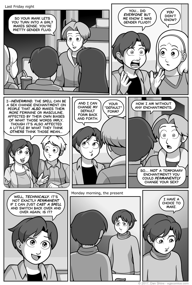 I wanted Tedd's spell to be individualized in such a way that people with different biases about gender roles would be affected differently by it, but I also wanted to guarantee that there'd be some changes in that regard even with someone who rejected the very notion of anything being specifically masculine or feminine.