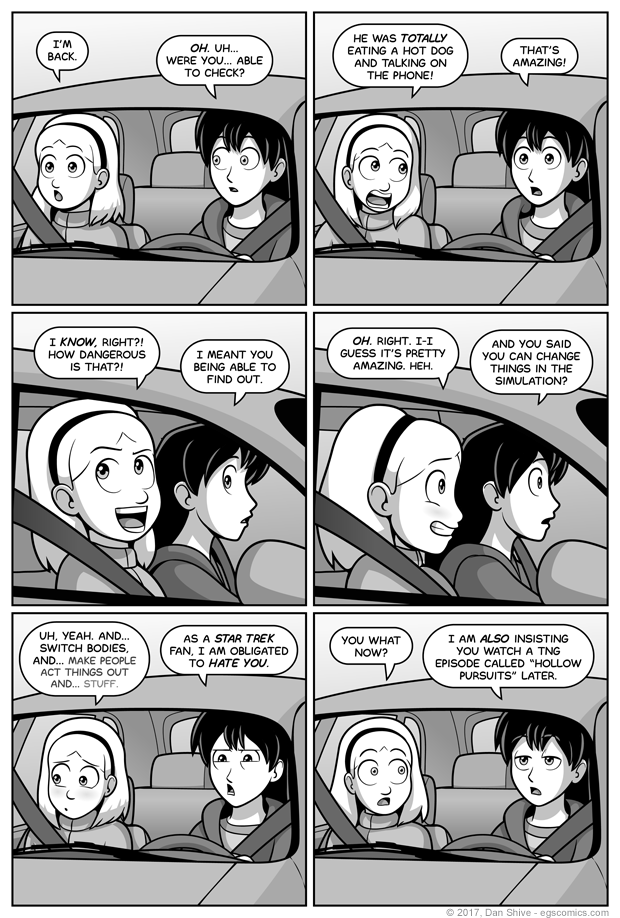 For those unfamiliar, "Hollow Pursuits" is an episode of Star Trek: The Next Generation that deals with an introverted crew member's anxiety issues and their addiction to spending time in a Holodeck, a room that can basically simulate any sort of reality one wants (including recreating holograms of real people indistinguishable from reality, which this crew member did).