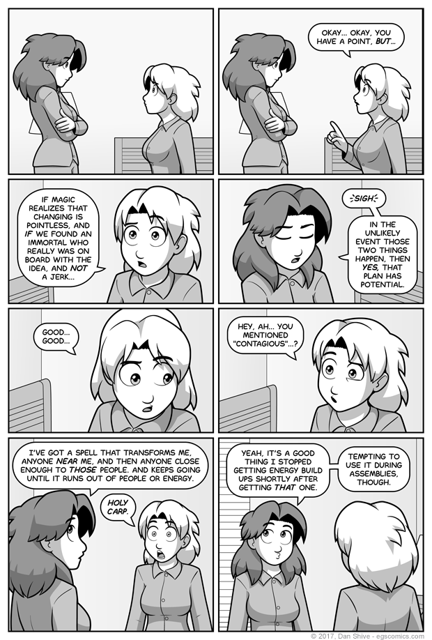 The entire existence of this new, now canon spell of Ellen's that she's unlikely to ever actually use in canon (short of fun with friends) is owed to the fact that I didn't want to end this comic and, indeed, this part of Sister 3, on Elliot clearly showing his abandonment forever of this immortal involvement idea.