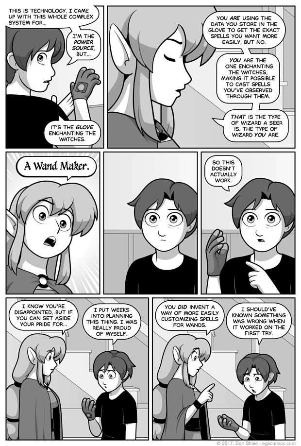 I had more potential ways for Tedd to put a negative spin on this, but there was a limit to how much could be in the actual comic. One I'll miss is Tedd comparing the accomplishment Pandora points out in the last panel to putting training wheels on a bike, and saying that he's not even a good enchanter because he needs the help.