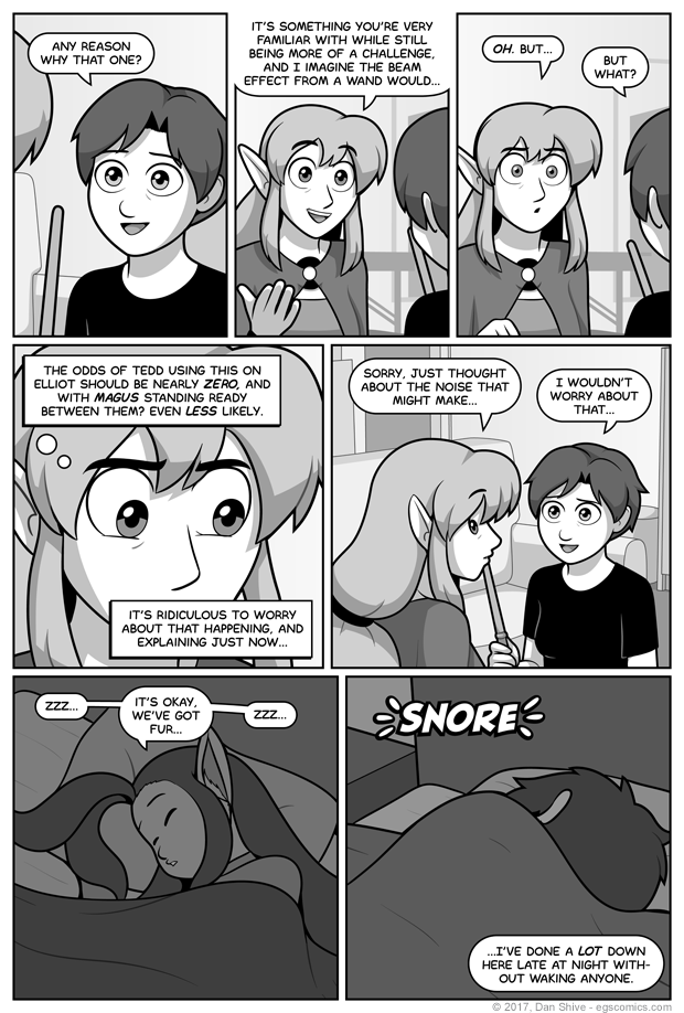 Fortunately, we now also have a reminder of Magus's objective of being in the path of Ellen's beam as it is being fired at Elliot (yay), and I get to lampshade the heck out of Grace and Mr. Verres sleeping through all of this.
