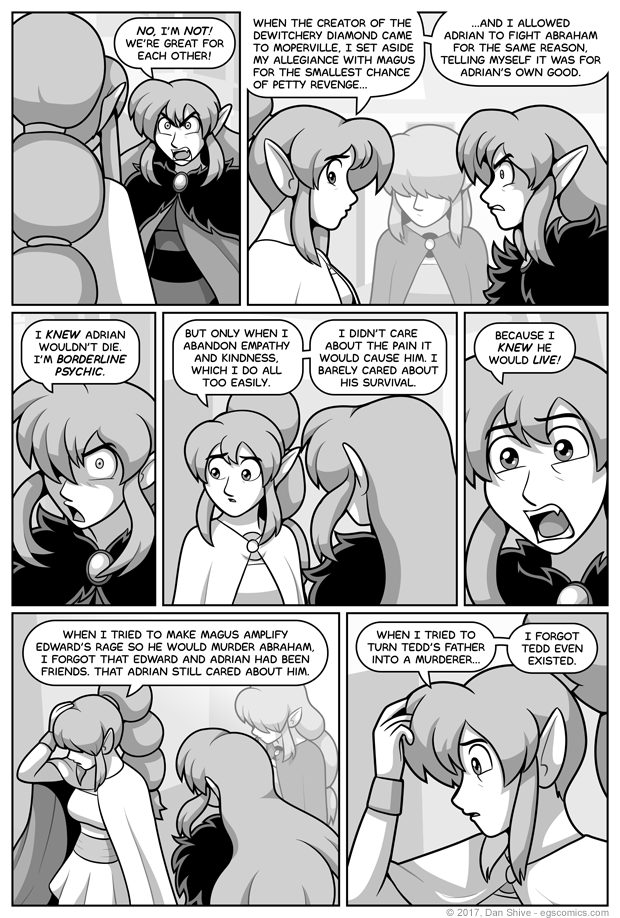 I went back on forth on whether to have Pandora use "I" or "you" while talking to herself, and ultimately decided that "I" better reinforced there still being just one actual Pandora, and that it was somehow more unsettling to boot. Win-win.