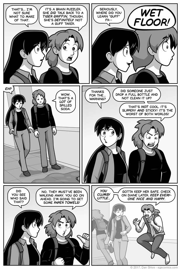 I later realized, however, that if you can't see Elliot's face, it would be possible to assume that he was the one who said "wet floor", and that would have made the rest of the comic super confusing.