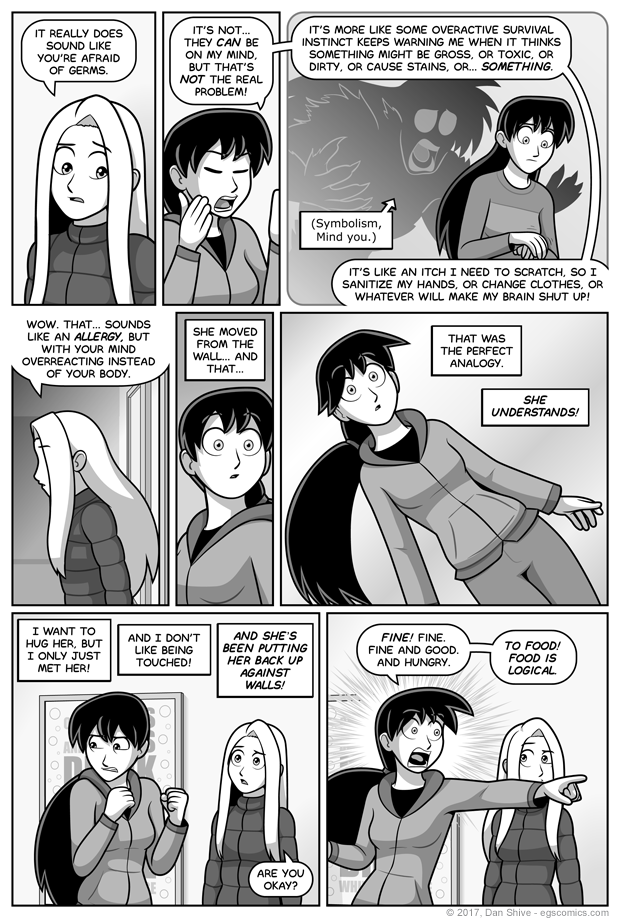 Diane’s analogy in panel four is one I have used myself to describe how I react to some things. I know my feelings are disproportionate to the problem (assuming there even is a real problem), and when I heard a description of how some physical allergies worked once (hypersensitivity and a defense worse than what it defends against), it sounded awfully similar.