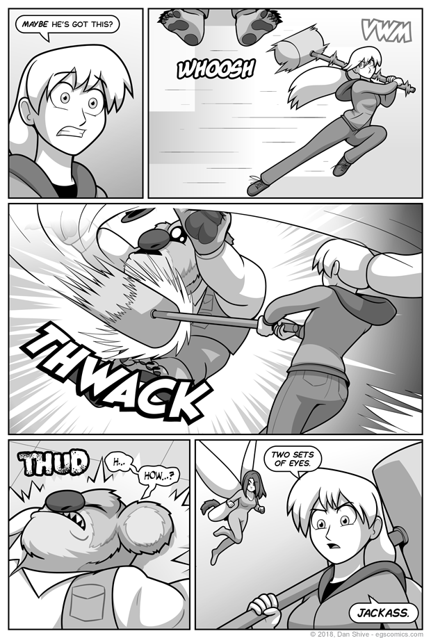 VERY technical note: That hammer in the last panel is actually a newly summoned one. Stun hammers are one use only. Wishing to avoid the potential interpretation of her un-summoning the hammer at a moment in which it would be baffling to do so, however, I did not include any visuals or "VWM" to that effect.