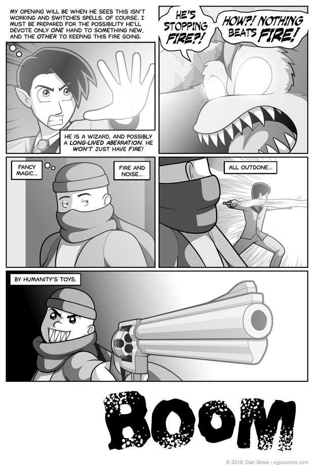 Scarf’s gun might appear unrealistically huge. This is due to a combination of perspective, and it being inspired by an actual gun that didn’t look real to me, either, when I first saw it. It is, to the best of my admittedly limited understanding of guns and ammo, an oversized revolver that uses .50 caliber bullets, and is capable of taking down large animals like moose and Alaskan brown bears.