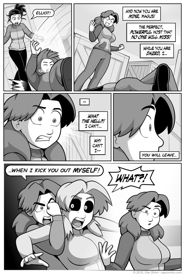 I wasn't 100% sure about making Magus's clothing a different color from Elliot's, but I feel validated after this comic, as it makes it visually apparent who is who in the first two panels without having to show Magus's hair. Granted, I could have gone with different angles, but I had faces I wanted to show, which limited my options somewhat.