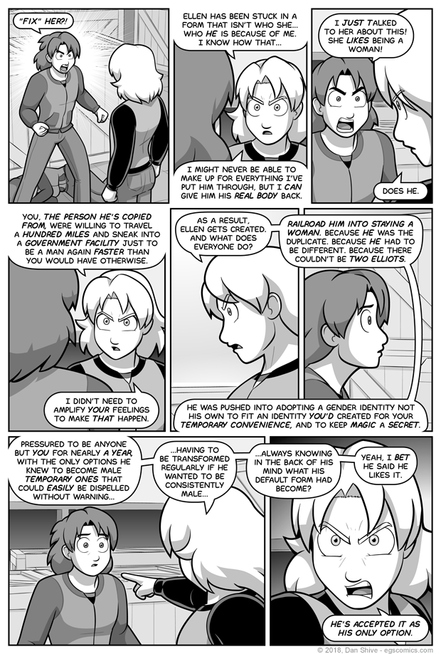 I feel I made a mistake in the previous comic in that I presented information regarding Magus’s world and how they perceive gender in such a way that it could be interpreted that Magus simply wanted to make Ellen male because “she’s a fighter, so I’m going to transform her based on how my world does things.”