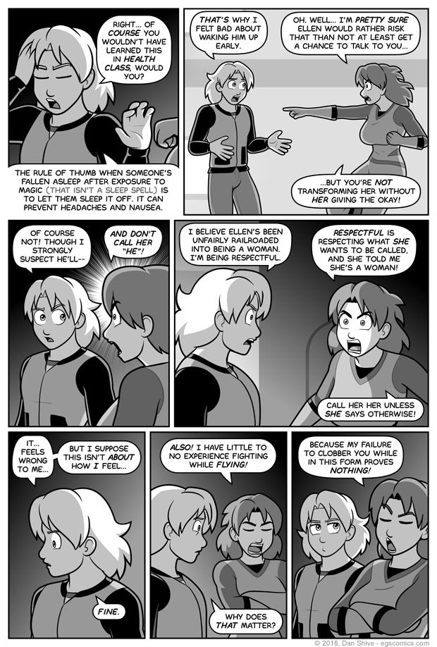 Granted, I hadn’t actually planned on addressing this issue in this story. I got to the moment in which Magus was going on about how he viewed Ellen’s situation, however, and I realized that’s what made sense for Magus. Correcting himself and using male pronouns was the in-character thing for him to do. Now it’s in character for Elliot to be nettled about it.