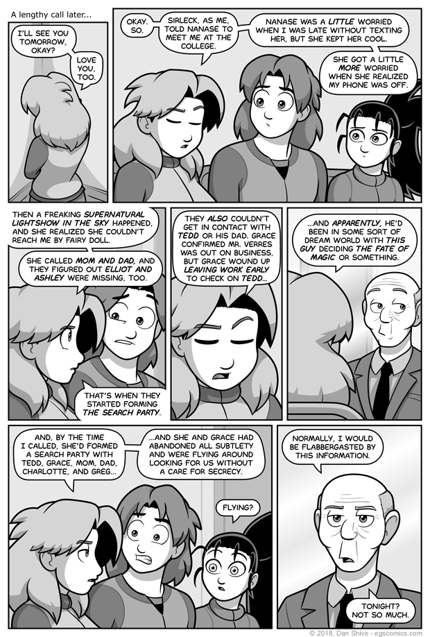 - Arthur and Tedd's wacky adventureThis is a whole lotta tell and not a whole lotta showing, but it would be SUCH a lengthy diversion to show the full events Ellen is describing in any way that would be worth showing, and the exciting conclusion would be "Ellen calls and everyone goes home".