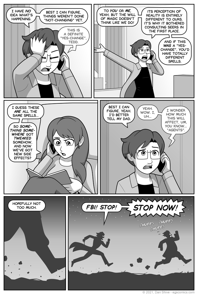 The previous page was originally less clear on this, with text in the first panel saying "...if anyone regularly checked their spell books." This didn't specify how regularly, giving some the impression that people hadn't checked them in weeks, and had somehow just missed these changes in all that time.