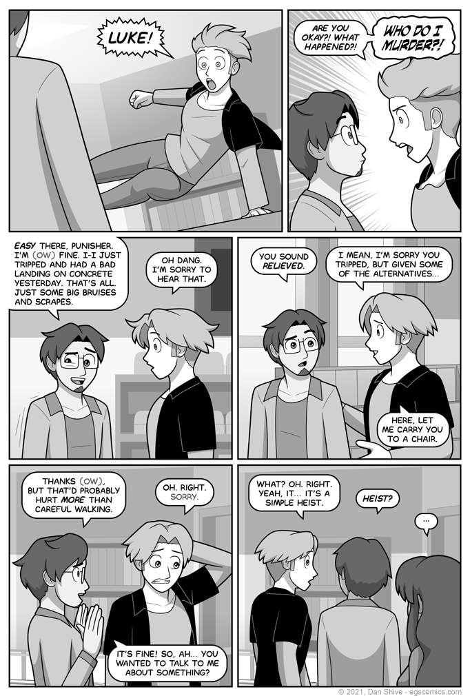 Speaking of strong arms, I kept wanting to draw Justin dramatically grabbing Luke's shoulders in this comic, but had to keep reminding myself of what a jerk thing that would be for him to do when Luke's showing signs of soreness.