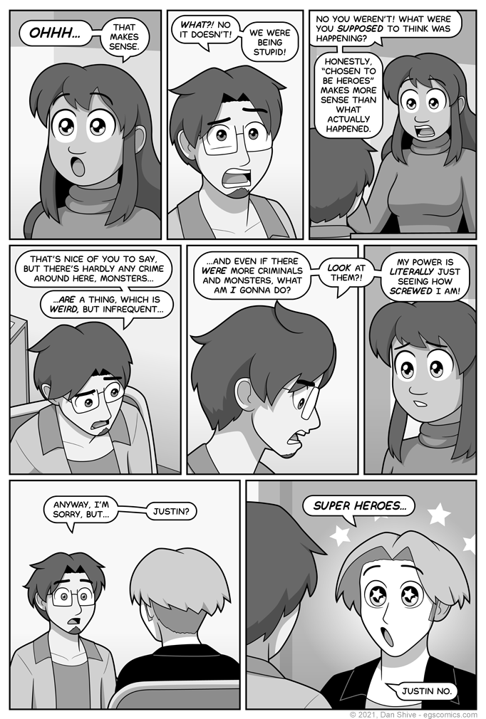 Yes, that's pretty insensitive of Justin, but he's obligated to geek out on occasion, and he was too distracted by circumstance to do so properly when Cheerleadra first showed up.
