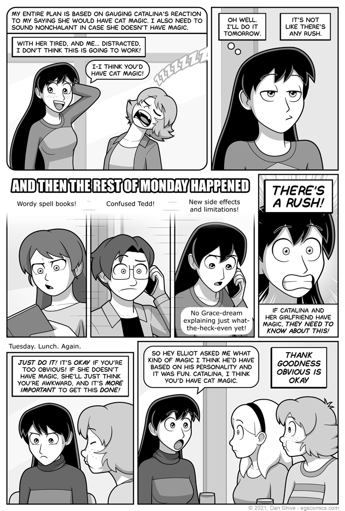 Given new page pacing combined with jumping around days of the week, however, I felt it best to have text reminding everyone of the situation, and to make clear that this was before Grace got any helpful explanation.
