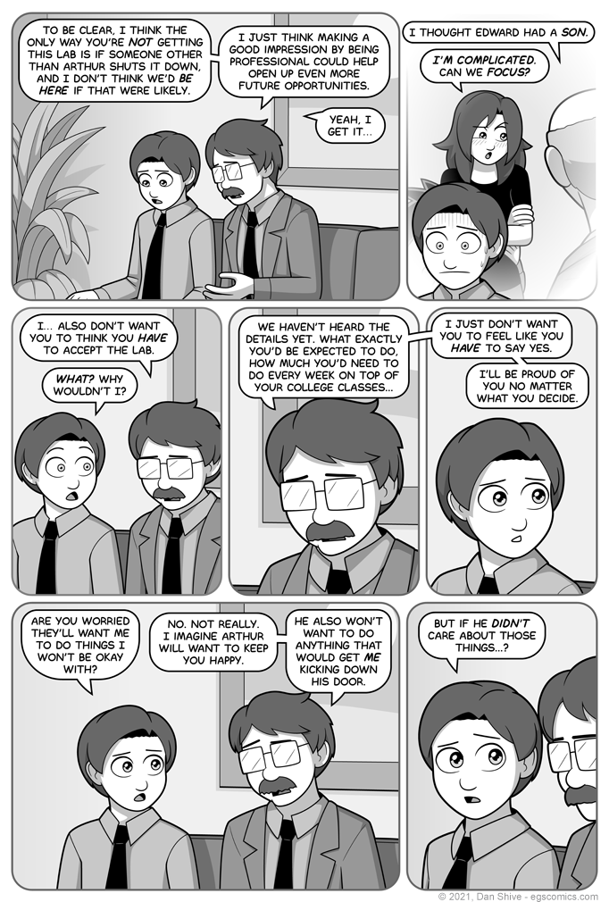 I've been eager for what is basically this flashback scene for a long time. I say "basically" because it's been so long that what I originally imagined barely resembles this scene. For one thing, I used to imagine this scene happening at Tedd's house.