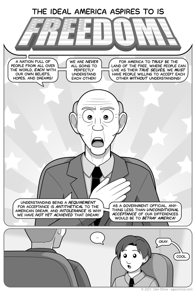 Anyway, I wanted it to be clear that Arthur does not think that America has achieved this ideal. This is not what he thinks America is. It is what he thinks America has the potential to be, what it SHOULD be, and what he hopes it will one day achieve.