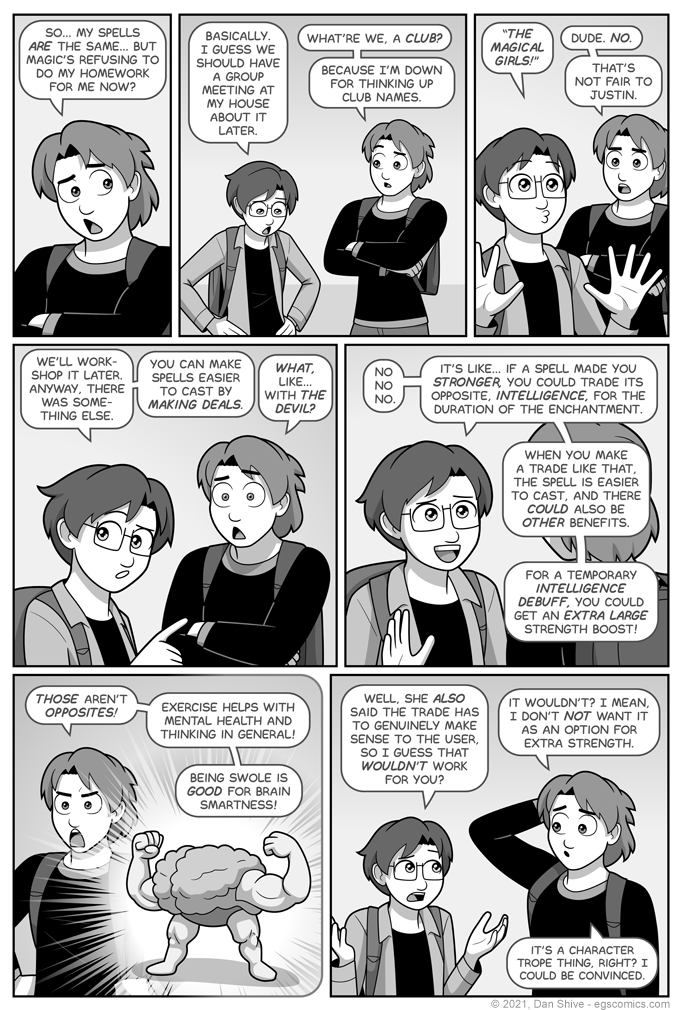 In place of narration or zooming out in a page with a fair amount of dialogue and faces, I have gambled upon people being able to instantly know that Elliot and Tedd are at school due to the power of backpacks.