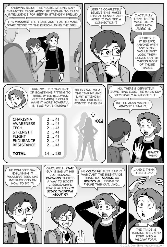 In answer to a fair question, yes, the Cheerleadra spell involves strength boosting, but there's so much more to the spell that a brain-smarts reduction wouldn't work as a trade. I wasn't planning on addressing that in-comic anytime soon, but again, fair question, so addressing it here for now.