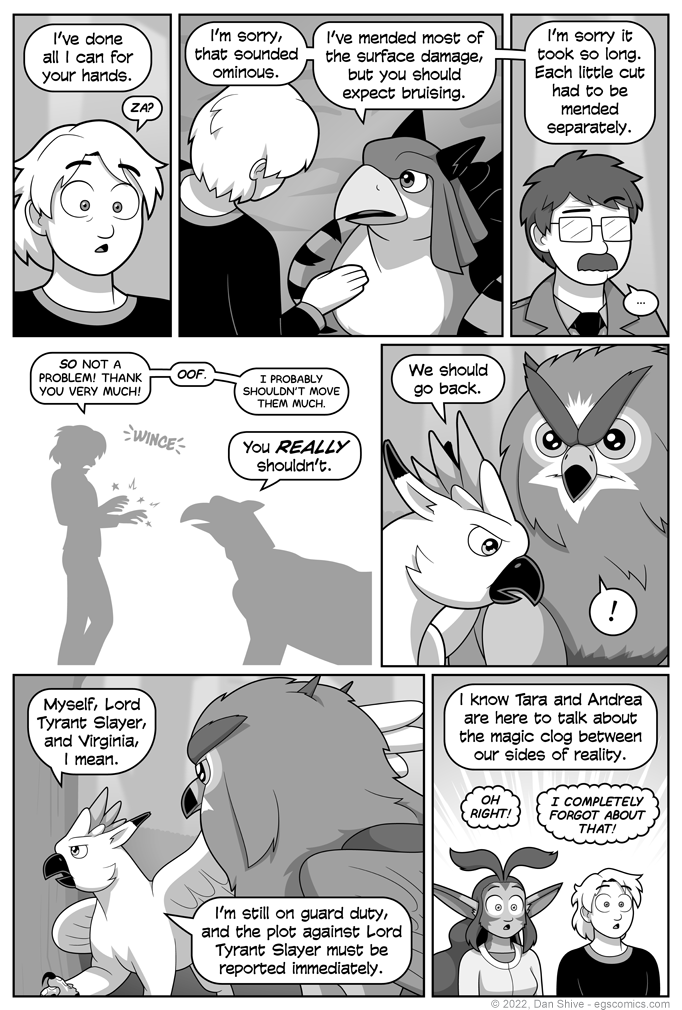 I admit, it makes the healing magic in this comic seem pretty first level, but Tara did just heal up a lot of harm to Elliot's hands over the course of a few minutes by waving her claws around. That's better than we can do, at least.
