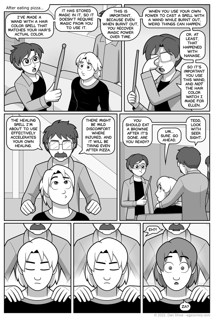 Nanase's hair grew extra long as a side effect of still recovering magic while burnt out. When Nanase used a magic watch to try to control her hair length, it started growing uncontrollably, then stopped (right after being cut off, whoops). After that, the cut hair went "poof" in a burst of magic, making Nanase and Sarah's hair grow (Tedd resisted this magic because of seer-related nonsense).