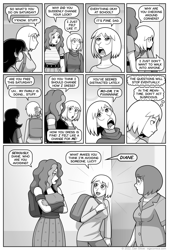 That extra person in the last panel is just there to make the hallway seem less empty (I also originally planned a silhouette in the background hallways, but it looked too busy), and is a teacher who was briefly seen in the EGSNP storyline Jestful Statement.