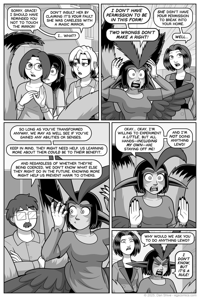 In the previous commentary, I mentioned there could have been a dramatic discussion prior to choosing to touch the mirror. Panel three gets into the argument for doing so, and Grace's reaction gets into why it would be dramatic and worthy of all the shiny writing awards that exist in the universe.