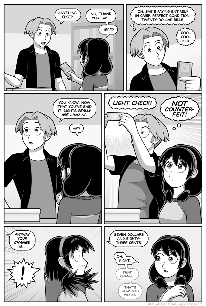 Holding twenties up to a light is one way to check for counterfeits. Certain things should be visible if genuine. There are other ways to be reasonably certain one is legit, but bringing lights back into it felt appropriate, and Justin wasn't really THAT suspicious of Hope.