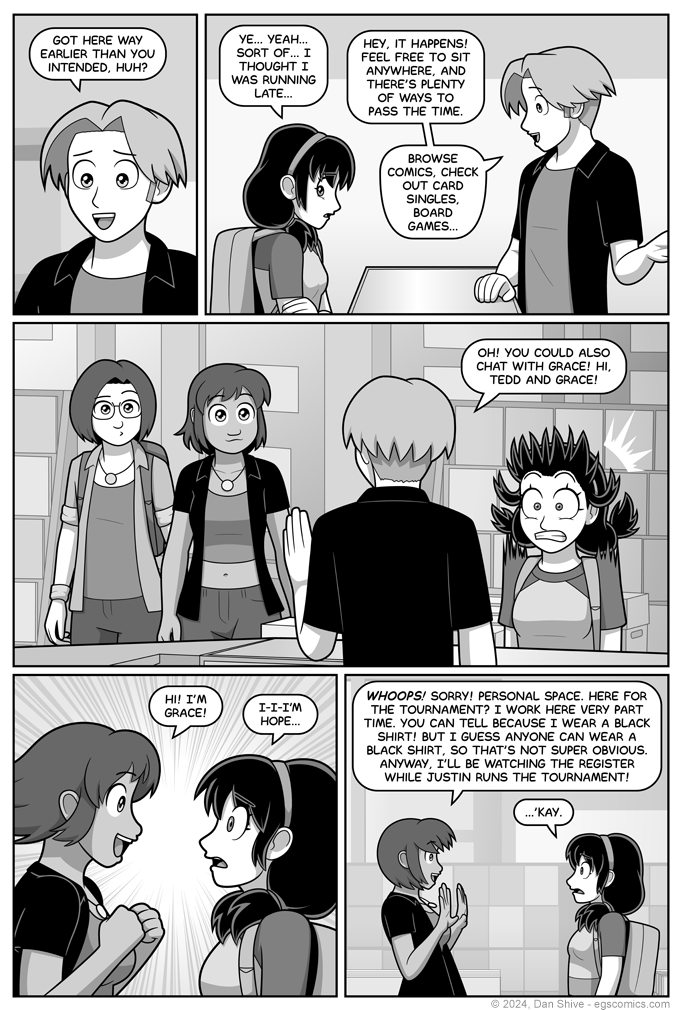 One of the most stressful things for me about this page was simply Grace's hair. I like it short, but I haven't been happy with the results I'd been getting drawing it short. Like, from just the right angle, under the right circumstances, on the right day of the week, in the right moon phase, I'd be really happy with it, but I wouldn't be satisfied the rest of the time.