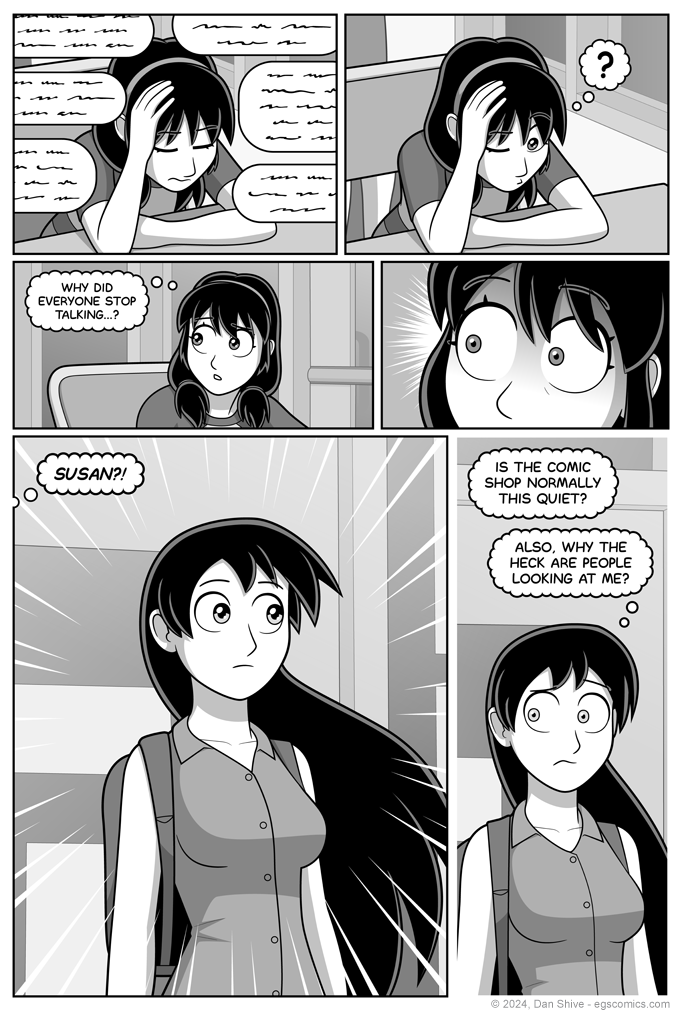 Naturally, I have no intention of answering this. It will forever remain a mystery why people in this comic shop would be so distracted by the sight of Susan as to go quiet and do a bit of staring.