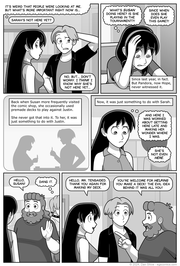 There's a version of this story arc in which there was a lot more setup, and we would've known before the tournament even started that Tensaided helped with (basically made) Susan's deck. Naturally, we also would've known that Susan was going to show up before Hope did, and a bunch of other things that I look at in retrospect and think "why would I reveal any of these things BEFORE the night of the tournament???"