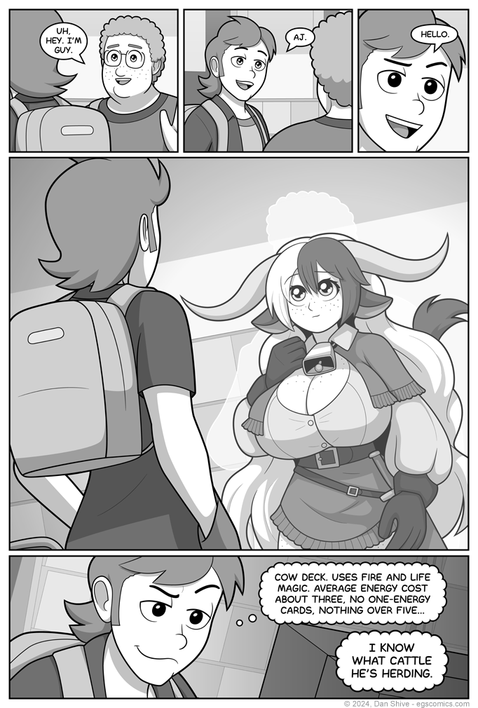 Now, I CALL it a cow deck, but the creatures in it are referred to as oxen, and tend to have horns closer to what's in this comic than how I typically draw them. In my search for inspiration / reference, I also saw a lot of really BIG cow horns (and cool curly goat horns), and I thought making them huge was nifty.