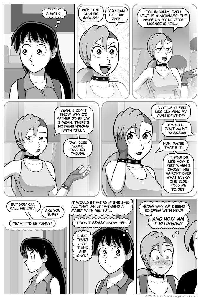Panel five has old dialogue with new art. Originally, Jay's dialogue from that panel was over Grace looking excitedly between Jay and Susan, which would be a bit weird on this page, so I didn't get to reuse art there.