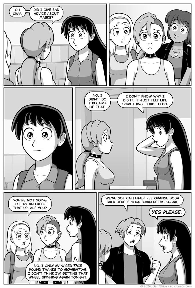 I'm not sure if anyone was seriously asking, but after the last page, people asked if Jay had shoved Sarah aside. She had not. I had sketched Sarah behind Jay, but I ultimately decided to just have speed lines in the foreground that completely hid Sarah.