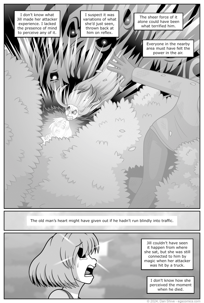 I was originally planning to have Jay see the what happened to her attacker, and I had no issue with that being part of the story right up until I realized it didn't really make sense.