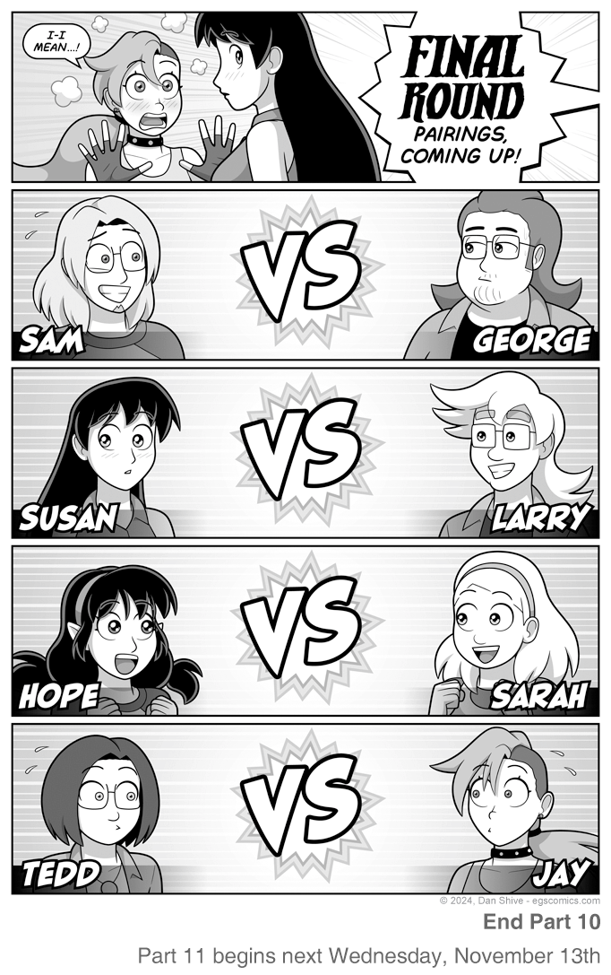 Which is probably the explanation for Susan playing against Larry, as Larry played against Sam in round two (suggesting he also lost in round one), and Larry lost in round two. Susan won the first two rounds (how she did in round three is unconfirmed, but probably not well).