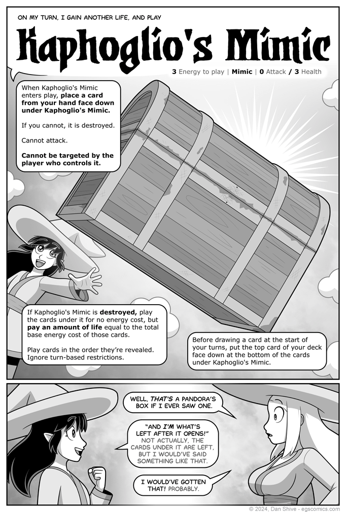 I'm PRETTY sure this card could be worded more efficiently in an actual card game in which terms could be used, and no one was worried about people who'd never played card games getting the general idea.