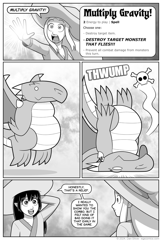 For simplicity's sake, the comic's just been saying "X energy" to play cards, but there are energy types with their own pros and cons. The type of energy Sarah's using has limited "destroy monster" options, and this is an example of that.