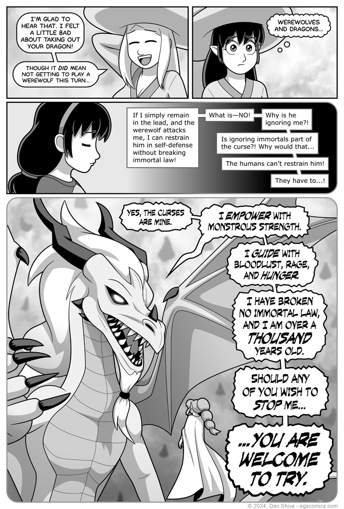 Poor Ohkie Rue Ne's design was influenced by my knowing this flashback was coming. Granted, it probably worked better for Ohkie to be more of a basic dragon, but it might have been designed to be scarier-looking if this guy wasn't a couple pages away.Yeah, so anyway, in case anyone was wondering where that werewolf curse came from?