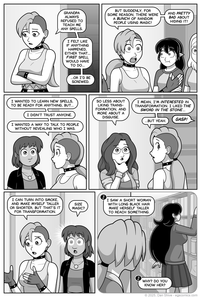 Jay happening to notice Rhoda giving in to the temptation and very briefly making herself taller to reach a high shelf in a store? Sure, I'll buy that. Rhoda's probably done it more than once. Heck, I'm much taller than Rhoda, and I'd be tempted to risk revealing I have magic to use such a spell.