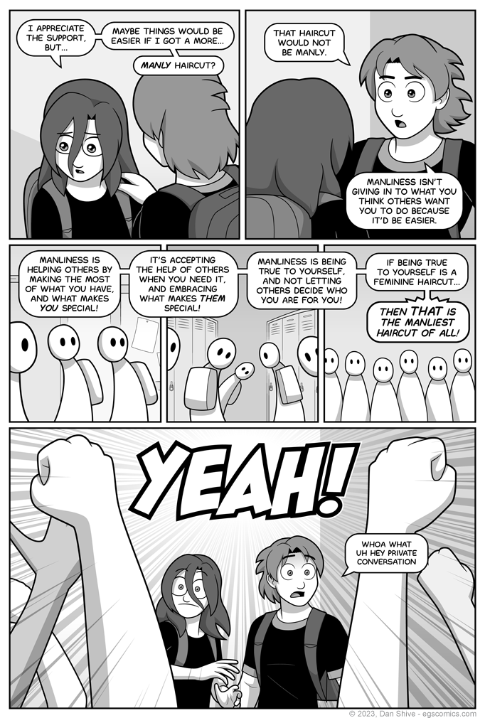 For this page, however, I wanted to convey that there were a bunch of people overhearing this, but I didn't want to actually be specific about any of them. There was just a small crowd. So I brought back the style I had in mind, but even simpler (I originally imagined SOME distinctive features, like hairstyles).