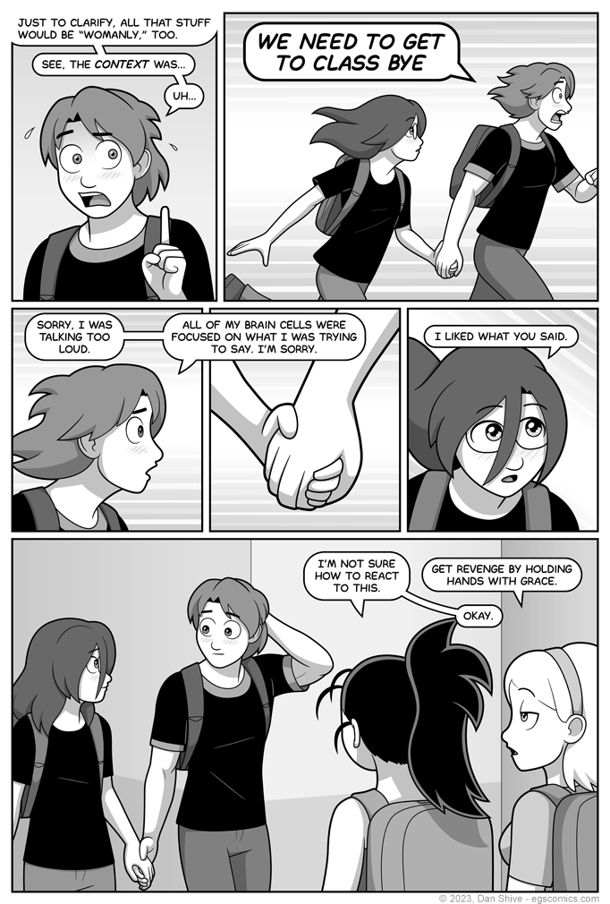 I originally planned on Tedd gently pointing out how nothing Elliot said was gender specific (not at all confrontational, just pointing it out), but that scenario required both Tedd and Elliot to ignore the small crowd that gathered in the previous page.