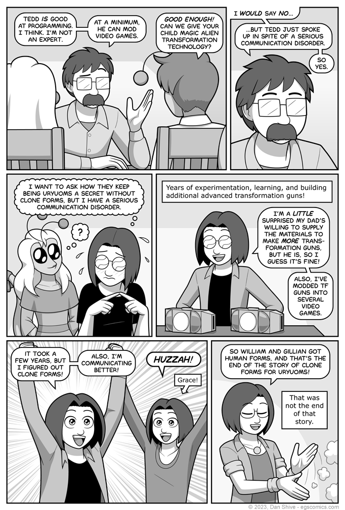 El Goonish Shive Introductions The Goo Shade, Part 1 Q&A #1 Shade, Part 2 Relations, Part 1 April Fools Week Relations, Part 2 Catnip Sister Part 1 - Open The Box Part 2 - Read The Rules Part 3 - Set Up The Pieces Part 4 - Play The Game Part 5 - Knock The Board Over Part 6 - Scattered Pieces Part 7 - Fist Fight Part 8 - Clean Up New And Old Friends Flipping Cardboard Lady Mysterious II slooF lirpA Squirrel Diplomacy Lunchtable Revelations Night Out Part 1 - Martial Arts Crew Part 2 - Elliot's Crew Part 3 - Ellen's Crew The Morning After Q&A #2 Tam Eh Tedd Painted Black Part 1 - Walk In The Park Part 2 - Missing Persons Part 3 - Interviewed By The Devil Part 4 - Into The Dungeon Part 5 - The Truth About Grace Part 6 - The Brewing Storm Part 7 - Fallen From Grace Part 8 - Humanity PB Special Features Shadows After Dark Sleepy Time Second Life The Child Left Behind Red Alert Before The Party Moping Squirrel Intro to South Party Recruiting Even More Recruiting Party Fashion Family Reuinion Grace's Birthday Party Part 1 - Arrivals And Presents Part 2 - Bending Genders Part 3 - Festivities Part 4 - Hold On Hope The After Party Q&A #3 Hidden Genesis Hidden Genesis In The Shadows The New Students Susan Draws The Line Squirrel In The Classroom Sister 2 Part 1 - The Trials Of Susan Part 2 - The Statue Part 3 - Pent-Up Magic Part 4 - Evil Monkey Part 5 - Moperville News Part 6 - Weregirl Part 7 - The Dark Clouds Gather Part 8 - Talon vs. Scythe Part 9 - Wrath of God Part 10 - Pandoras Box Q&A #4 Q&A #4 Bringing Silly Back Indiana Elliot And The TOSF T-Minus The Demon Ally Hammerchlorians - 1 Hammerchlorians - 2 Hammerchlorians - 3 T-Minus Dark Allegiance New And Old Flames - 1 New And Old Flames - 2 New And Old Flames - 3 New And Old Flames - 4 New And Old Flames - 5 New And Old Flames - 6 Q&A #5 Q&A #5 9001% Serious One Way Road Legends of Celida Death Sentence - 1 Death Sentence - 2 Death Sentence - 3 Death Sentence - 4 Death Sentence - 5 What Is Love Summer The End Of Spring Power Fantasy Rocks Fall Nobody Is Hired Nepotism Hair By The Numbers Duel Of The Discs There Be Whales Here There Be Whales Here Pt 2 There Be Whales Here Pt 3 The Dawn End Of An Era End Of An Era pt 2 Family Tree Family Tree Part 2 - Arrival Family Tree Part 3 - Par-TAY Family Tree Part 4 - Weirdness Family Tree Part 5 - A Troll Family Tree Part 6 - Banhammered Family Tree Part 7 - Hangover Q&A #6 Identity Identity Part 2 - Reactions Identity Part 3 - Cat Attack Identity Part 4 - Detective Sarah Identity Part 5 - Basement Chat Identity Part 6 - ILLOGICAL! Identity Part 7 - Dreams identity Part 8 - Ashley Identity Part 9 - Detective Susan Identity Part 10 - Ashley and Elliot Identity Part 11 - Epilogue Summer Moments Guest Comics Guest Comics #1 Guest Comics #2 Pandoras Box Squirrel Prophet SP - Part 2 SP - Final Battle So A Date At The Mall So A Date - Part 2 So A Date - Part 3 So A Date - Part 4 So A Date - Part 5 EGSNP - Question Mark Q&A 7 - The Requestioning Sister 3 - Catspaws Part 1 - Legacy Part 2 - The Will of Magic Part 3 - Reply Hazy Part 4 - Everyone Needs To Talk Part 5 - The Reservoir Part 6 - Maybe Sisters Part 7 - An Unkindness Part 8 - Awkwardness Ahead Part 9 - Traffic Freeze Part 10 - Fluidity Part 11 - All Of The Curse Words Part 12 - Misanthropy Part 13 - In Search Of Wisdom Part 14 - Sister Anxiety Part 15 - Elliot and Ellen Part 16 - BFFs Part 17 - Great Fairy Godmother Part 18 - Gathering Monsters Part 19 - Family Meetings Part 20 - Geminis Part 21 - The Other Dunkel Part 22 - Apocalypse Part 23 - The Fate Of Magic Part 24 - Elliots And Ellens Part 25 - Changes Part 26 - Epilogues The New World The Legend of Diane The Secret of Sam Q&A 8 - The Lord Of The Q&As Title Pending Title Pending 2 - Even More Pending Title Pending 3 - Untitled Party Title Pending 5 or 6 Balance Part 1 Part 2 Part 2-B Part 3 Part 4 Part 5 Part 6 Part 7 Part 8 Part 9 The Road Ahead Brother Father Our Future Recruitment Layers, Part 1 Layers, Part 2 Layers, Part 3 Layers, Part 4 Hope, Part 1 Hope, Part 2 Hope, Part 3 Hope, Part 4 Hope, Part 5 Hope, Part 6 Hope, Part 7 Hope, Part 8 Hope, Part 9 Hope, Part 10 Hope, Part 11 Hope, Part 12 False Kings False Kings, Part 1 False Kings, Part 2 False Kings, Part 3 False Kings, Part 4