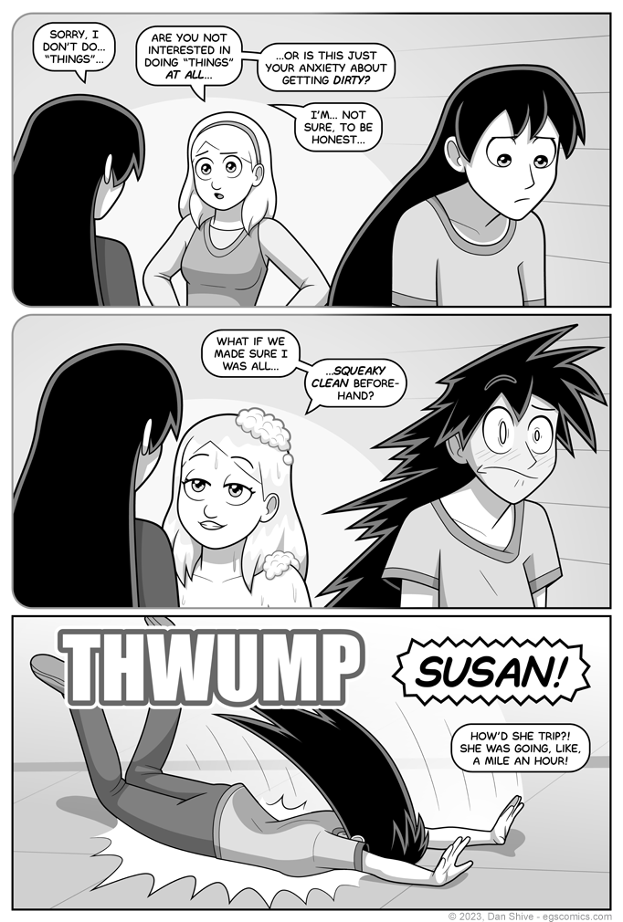 This page, and the previous two pages, were a result of me repeatedly thinking things like "then Susan thinks about how she feels, and... No, actually, that's a bit dull. How else can I get that across? Flashback panels? Those aren't much better, and might not be clear about Susan's feelings... What about Fantasy panels? Yeah, those could be interesting."